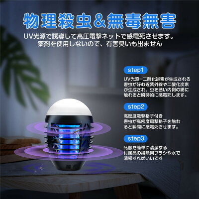調光(LED明るさ):3段階切替(20%/50%/100%/OFF) 2、一切薬剤を使用せず、物理的な方法で害虫を退治でき、無毒無害のアイテムです。